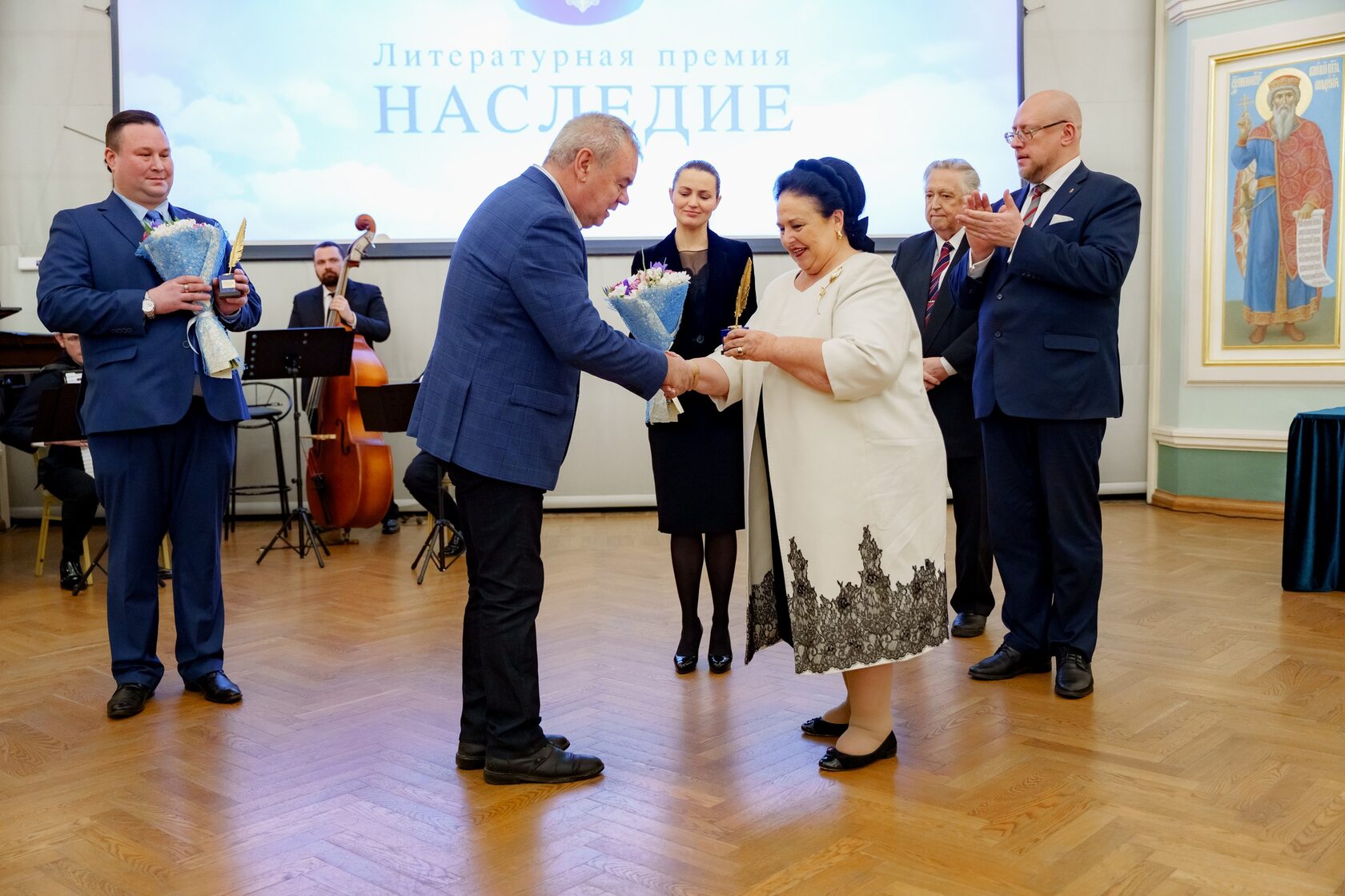 Для оглашения результатов на сцену был приглашен начальник Управления по межрегиональным и международным связям Канцелярии Ее Императорского Высочества, Главный координатор Высочайших визитов, кандидат медицинских наук, доцент, член Высокого жюри премии «Наследие» князь Вадим Лопухин. Он поделился, что уже 13 лет ежегодно знакомится с произведениями финалистов и замечает, что с каждым конкурсным сезоном уровень произведений участников становится выше и с литературной, и с нравственно-этической точек зрения. После этого Вадим Лопухин зачитал протокол и огласил имена лауреатов литературной премии «Наследие» за 2025 год. На сцену вышли победители: прозаики Евгений Баранов из Иваново, Егор Толубаев из Москвы и поэты Сергей Матыцин из Воронежа, Анатолий Лебедев из Екатеринбурга и Александр Чжоу из Москвы. Под аплодисменты Великая Княгиня Мария Владимировна вручила каждому лауреату символ премии – статуэтку в форме пера на постаменте из афганского лазурита и памятный диплом.
